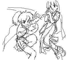 | これはストーリーからできあがりました。 おおまかにまとめると、石像に封印されていた女神を復活させようとしていたところ石像が真っ二つにされてしまい、復活した女神も二人、しかも子どもの姿になってしまった、というものです。 この頃から、シャギ消しとかにさらに力を入れるようになりました。 以前もやってはいたんですが、まだまだ不十分でした。MSXの場合、こういうのはすべて手動でやることになります。 X68kなんかでもそうなんですが、画面がやたら広いのでもっと大変なんでしょうねえ。