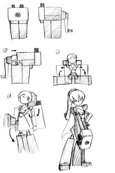 3.右腕はそのまま下ろします。左腕は肩を90度回転させた後、腕を 下ろして伸ばします。最後に足を下ろして変形完了です。