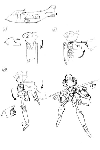 3.足を伸ばし、爪先を展開します。腕からは手をひっぱり出します。 そして尾翼部分だけを倒します。
