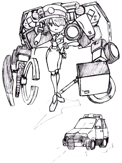 後頭部から巨大な手錠状のアームが生えてますが、これは備安さんが発表した婦警さんのアイデアを使わせてもらってます。