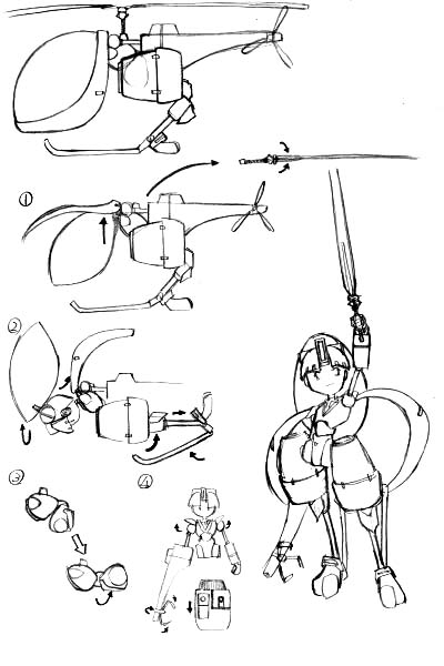 4.両肩のカバーを起こした後、腕を開きます。右腕は図のようにL字型になっており、 ひじ部分を下にスライドします。最後にテールローターを曲げて変形完了です。