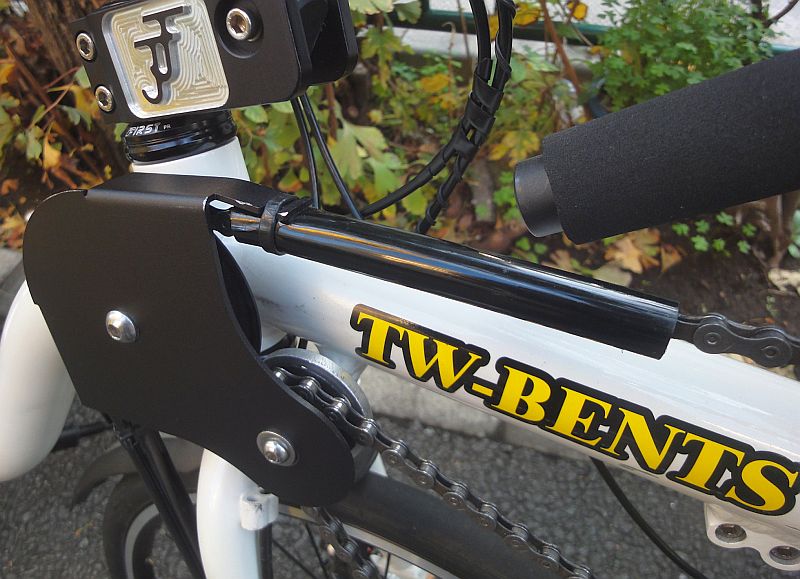 後ろサス付きUSSで、電動アシスト仕様。シート背面に予備バッテリも積載されていますが、電動アシストは発進時と登り坂のみでの使用で、数時間かけて水元公園に来るのにフル充電から1/4程度しか消耗しなかったとのこと。