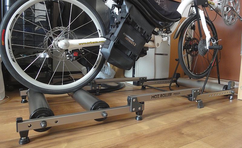 その点、リカンベントの場合は車高が低いので、ローラー台に乗せても余裕で床に足が着くのはいいところですね。